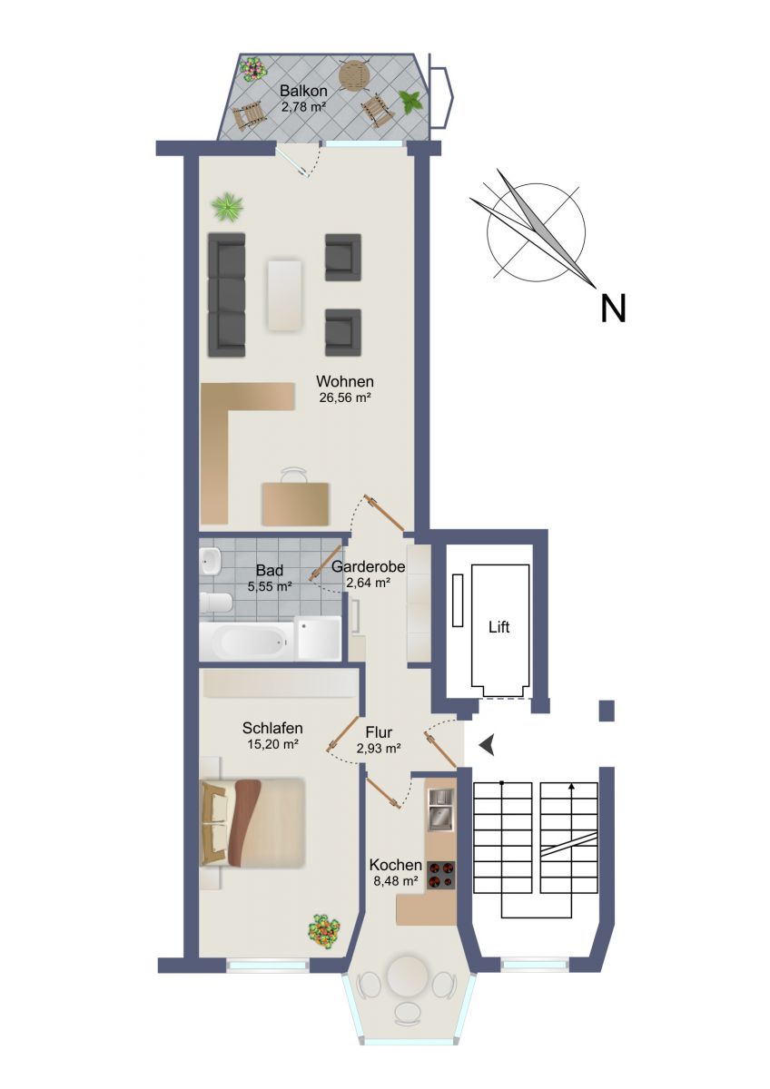 Die angebotene Wohnung befindet sich im 2. Obergeschoss des Hauses, ist derzeit vermietet und befindet sich in einem ungekündigten Mietverhältnis. Die Wohnfläche von ca. 65 m² verteilt sich auf das zum Garten ausgerichtete Wohnzimmer von rd. 27m², ein Schlafzimmer mit ca. 15 m², ein weiß gefliestes Badezimmer mit Wannenbad, eine Garderobe, Flur und eine Küche mit Möbeleinbauten sowie üblichen Elektrogeräten. Ein sonniger Balkon zur Gartenseite lädt zum Verweilen ein. Ein Bodenraum von ca. 5 m² Fläche gehört ebenso wie ein Tiefgaragenstellplatz zur Wohnung. Die Aufteilung der Wohnung entnehmen Sie bitte der Grundriss-Skizze.