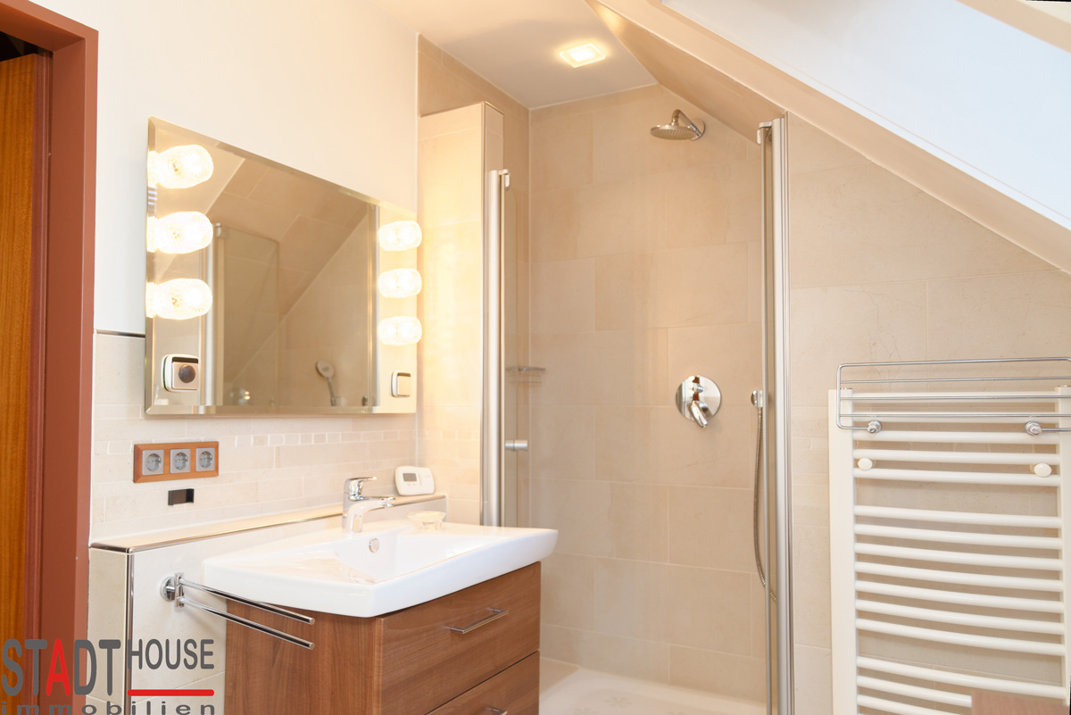 Das mit einer Fußbodenheizung ausgestattete Erdgeschoss mit rund 61 m² Wohnfläche, ist konsequent auf Offenheit und Licht ausgerichtet. Der großzügige Wohnbereich ist zum Essplatz hin offen gestaltet, was ein luftiges Raumgefühl schafft. Der stilvolle offene Kamin bildet das optische Highlight und sorgt an kalten Tagen für eine unvergleichliche Atmosphäre. Die voll ausgestattete Küche, mit hellen Einbaumöbeln und den üblichen Elektrogeräten bietet viel Arbeitsfläche und hat einen Zugang zur Diele und zum Esszimmer. Im ebenfalls mit einer Fußbodenheizung ausgestatteten Obergeschoss befinden sich zwei weitere Räume, eines davon verfügt über eine Loggia und einen Ankleideraum. Das im Jahr 2010 erneuerte Vollbad besticht durch modernes Design und hochwertige Sanitärobjekte. Der ausgebauten Spitzboden ist über eine vollwertige Treppe erreichbar. Die Ausstattung des gesamten Hauses entspricht dem gepflegten und modernen Charakter des Anwesens. Ein Bezug kann ohne jegliche Renovierungsarbeiten erfolgen. Die Aufteilung entnehmen Sie bitte den Grundriss-Skizzen und der Wohnflächenberechnung.