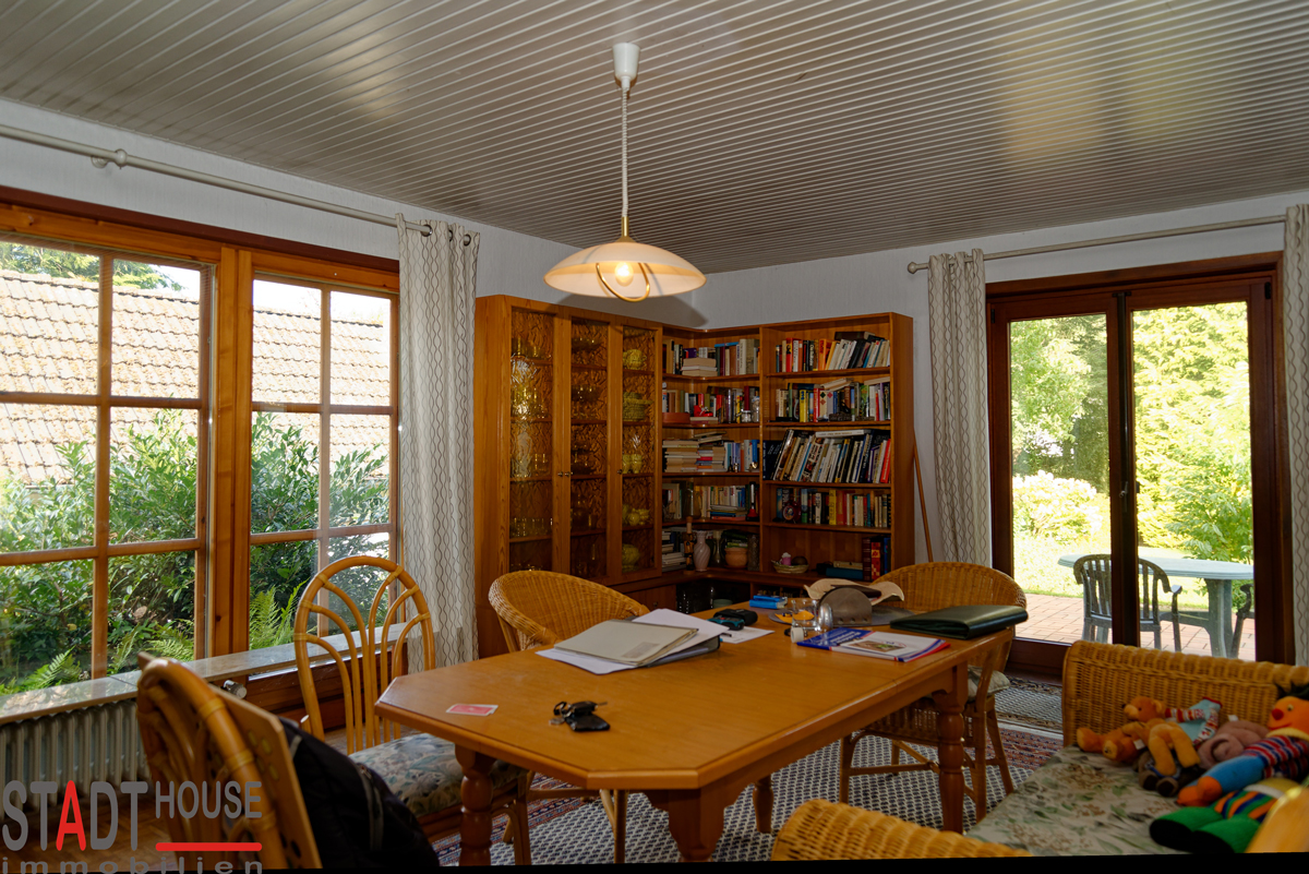 Das familiengerecht ausgestattete Haus, mit rund 164 m² Wohn- /Nutzfläche, verfügt im Erdgeschoss über ca. 96 m² Wohnfläche und besteht aus einem gemütlichen 40 m² großen Wohnzimmer mit einem funktionsfähigen Kachelofen und Deckenvertäfelungen, einem Esszimmer, einer Küche mit Möbeleinbauten und Elektrogeräten, einem Arbeitszimmer und einem Gästezimmer, Badezimmer, Gäste-WC und einer Diele mit Zugang zum Obergeschoss. Im ca. 68 m² großen Obergeschoß befinden sich zwei große Räume, ein Duschbad und eine Bodentreppe mit Zugang zum Spitzboden. Die Ausstattung und Haustechnik des Hauses stammt aus dem Herstellungs-Baujahr und bedarf der kompletten Modernisierung. Im Jahr 1996 wurde die Erweiterung des Wohnhauses zum Doppelhaus, mit Keller- Erd- und Dachgeschoß zur Gartenseite geplant. Pläne für die Erweiterung liegen vor und können in unserem Büro eingesehen werden. Die Aufteilung entnehmen Sie bitte den unverbindlichen Grundriss-Skizzen und der Wohnflächenberechnung.