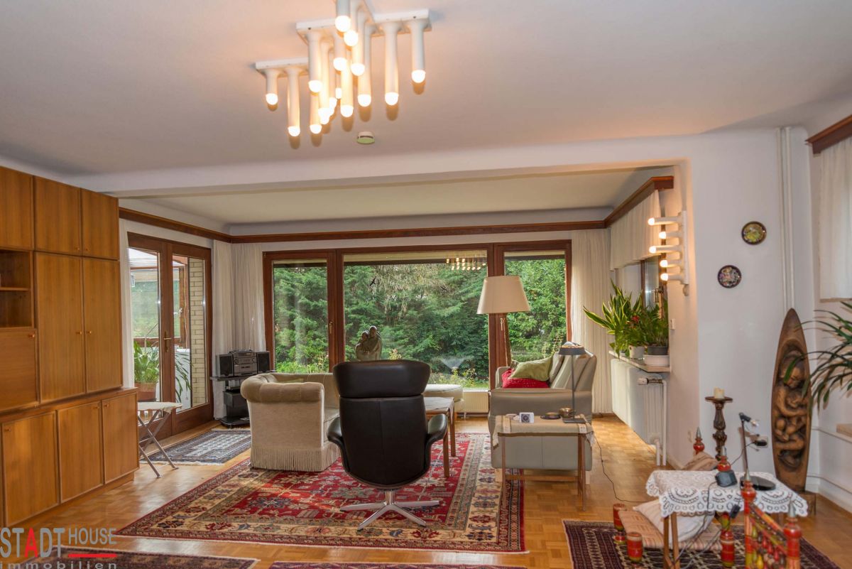 Das sich gepflegt präsentierende Gebäude wurde ursprünglich 1949 in massiver Bauweise, mit einem Erd- und ausgebauten Dachgeschoss sowie einem Vollkeller, errichtet. Eine Erweiterung des Hauses über drei Ebenen erfolgte 1959, 1988 wurde das Haus durch einen großzügigen Wintergarten erweitert. Das Gebäude ist mit Isolierverglasten-Hartholzfenstern, die überwiegend mit Außenjalousien versehen sind sowie Regenrinnen und Fallrohren aus Kupferblech ausgestattet. Das noch zu vermessende, über ca. 1.295 m² verfügende Grundstück ist zur Gartenseite nach Süd-/West ausgerichtet, herrlich eingewachsen, pflegeleicht angelegt und praktisch nicht einsehbar.