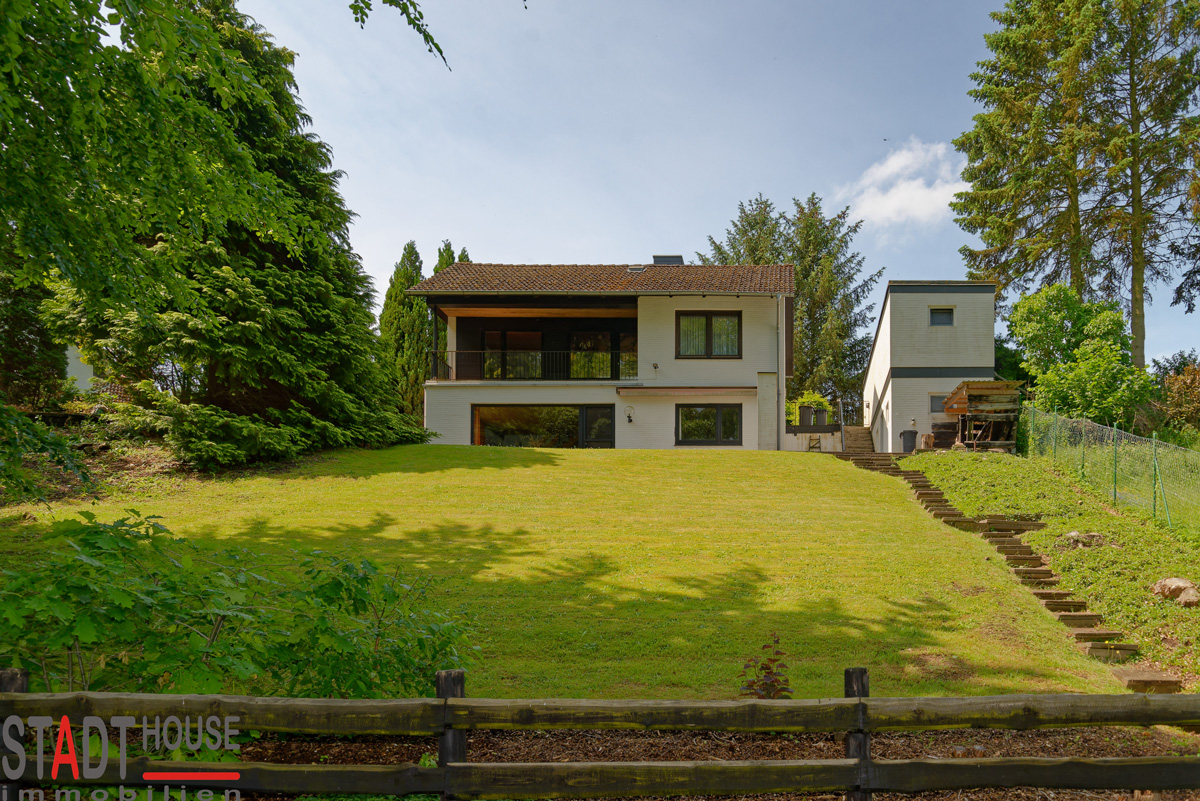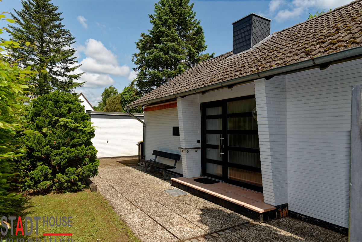 Das angebotene Einfamilienhaus wurde 1972 massiv, unter einem mit Betondachpfannen eingedeckten Satteldach und einer weiß gestrichenen Klinkerfassade, errichtet und präsentiert sich in einem gepflegten Zustand. Das Gebäude verfügt über zwei Vollgeschosse, wobei durch die Hanglage des Grundstücks, das untere Geschoß über einen direkten Zugang zur Terrasse und zur Gartenfläche verfügt. Das obere Geschoß, über welches das Haus betreten wird, verfügt über eine Loggia mit fantastischem Blick über den Seedorfer Küchensee. Im Jahr 2015 wurde das große, isolierverglaste Panoramafenster im Wohnzimmer, ebenso wie die überwiegende Anzahl der Nachtspeicherheizkörper und der Schornsteinkopf bzw. die Verkleidung, ausgetauscht. Die verglaste Eingangstür mit Seitenteil wurde im vergangenen Jahr erneuert. Neben dem Haus befindet sich eine Doppelgarage mit einem Geräteraum auf der unteren Ebene. Das auf der Gartenseite nach Osten ausgerichtete Grundstück ist liebevoll, mit einer Einfriedung aus Zäunen und Hecken, zahlreichen Büschen, Blühpflanzen und Bäumen, einer Rasenfläche und einer Terrasse, angelegt.