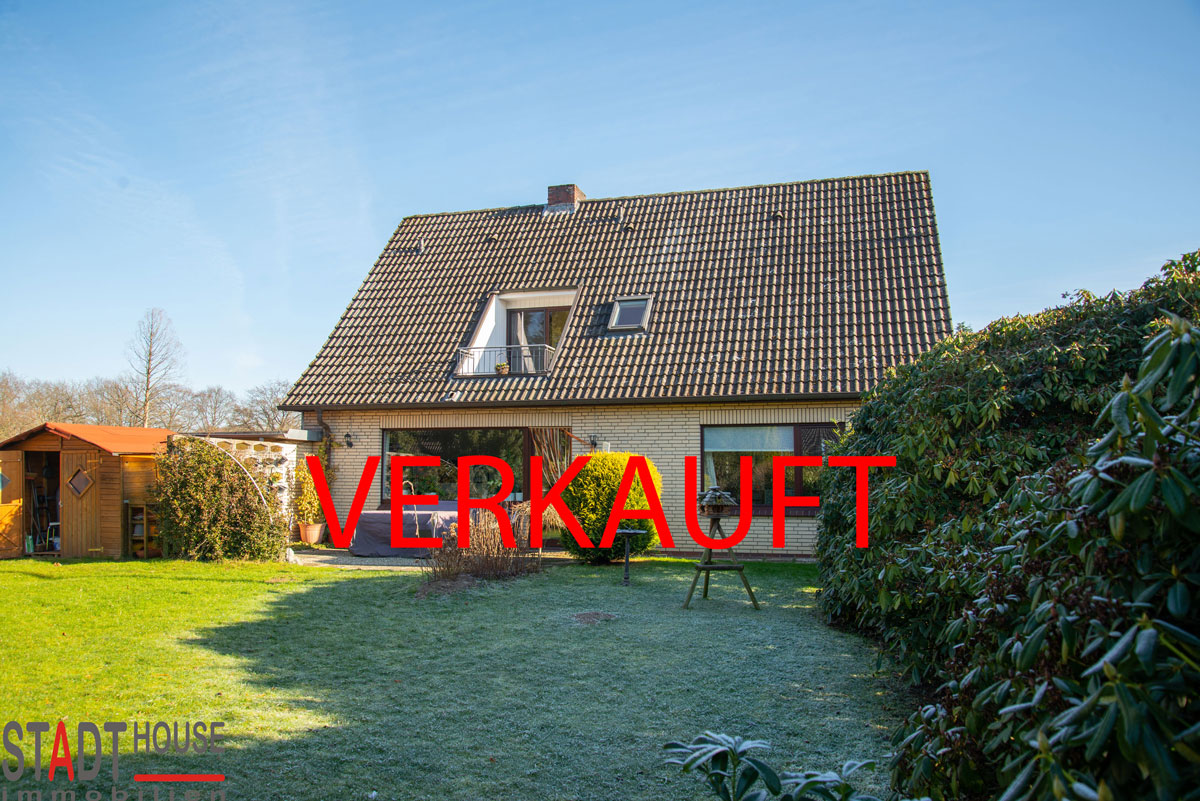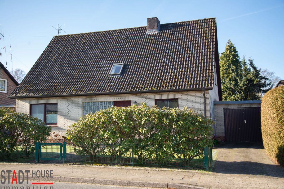 Das angebotene Ein-/Zweifamilienhaus wurde 1972 von der renommierten Firma „Holstein-Haus“ mit einem Vollkeller und Satteldach errichtet. Massiv und traditionell erstellt, präsentiert sich das mit Kalksandstein und gelben Vormauerziegeln erbaute Haus in einem sehr gepflegten Zustand. Das zurzeit als Zweifamilienhaus genutzte Gebäude wurde ständig, u.a. durch den Einbau von 2- und 3-fach isolierten Fenstern in den Jahren 2014 bis 2021, modernisiert. Kostengünstiges Ausbau- bzw. Erweiterungspotenzial zugunsten der Wohn-/Nutzfläche im Obergeschoss könnte z.B. durch eine Verkleinerung der ca. 1,5 m hohen Abseiten erreicht werden. Des Weiteren ist der Einbau einer Dachgaube im Wohnzimmer möglich. Das auf der Gartenseite nach Südwest ausgerichtete Grundstück ist pflegeleicht, mit einer Einfriedung aus Zäunen und Hecken, zahlreichen Büschen, Blühpflanzen und einer Rasenfläche, angelegt. Eine Einzelgarage ist ebenfalls vorhanden.